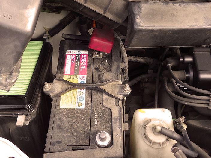 マイナス端子を外してからプラス端子を外しバッテリー本体を抜く